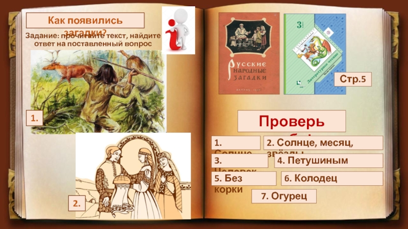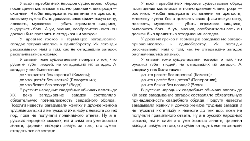 У всех первобытных народов существовал обряд посвящения мальчиков в полноправные члены рода — охотники. Чтобы выдержать испытание на зрелость, мальчику нужно было доказать свою физическую силу, ловкость, мужество — убить огромного хищника, выдержать боль. А ум, знания, сообразительность он должен был проявить в отгадывании загадок.
