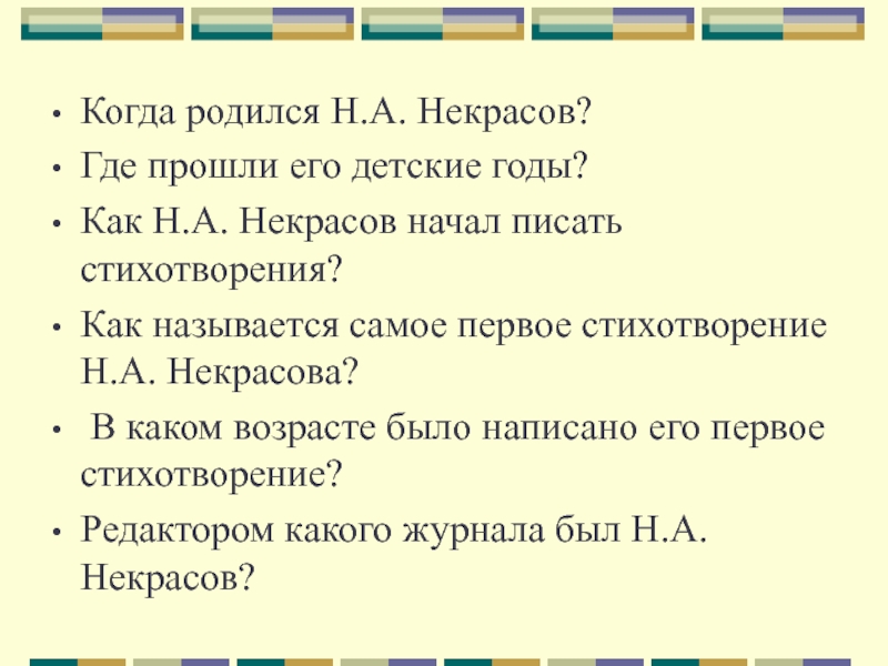 Когда родился Н.А. Некрасов?Где прошли его детские годы?Как Н.А. Некрасов начал писать стихотворения? Как называется самое первое