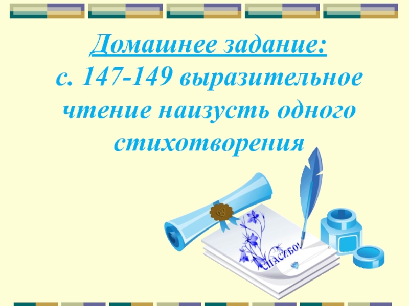 Домашнее задание:с. 147-149 выразительное чтение наизусть одного стихотворения