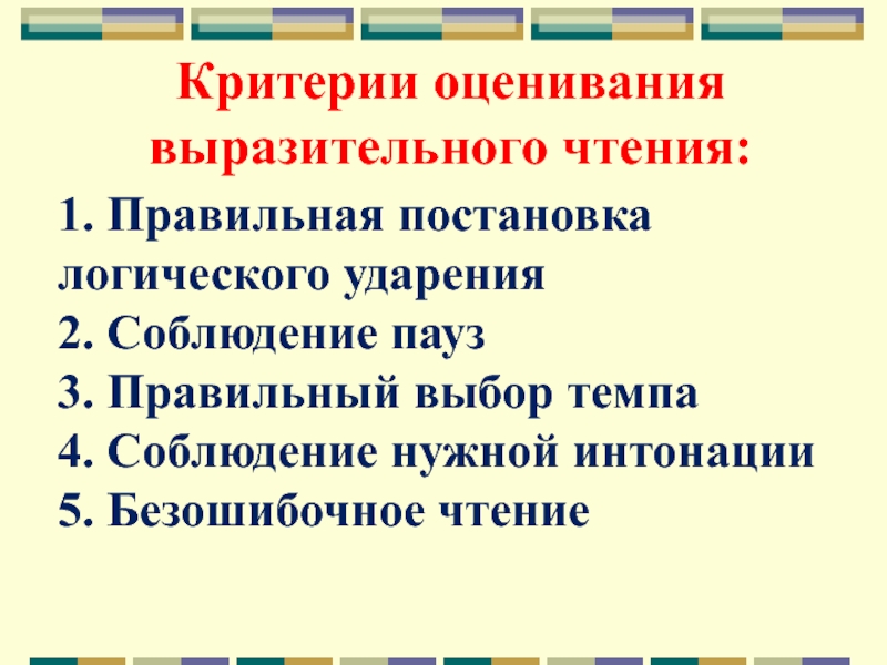 Критерии оценивания выразительного чтения:  1. Правильная постановка логического ударения2. Соблюдение пауз3. Правильный выбор темпа4. Соблюдение нужной