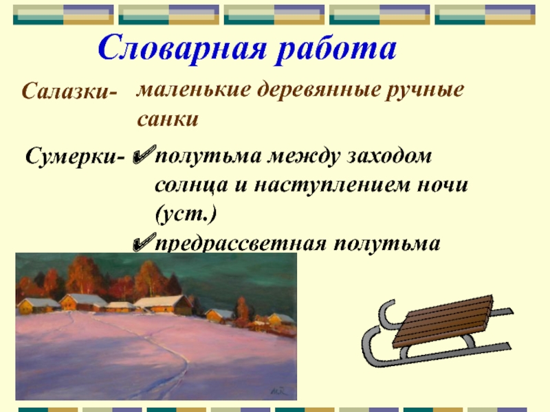 Словарная работаСалазки-маленькие деревянные ручные санкиСумерки-полутьма между заходом солнца и наступлением ночи (уст.)предрассветная полутьма