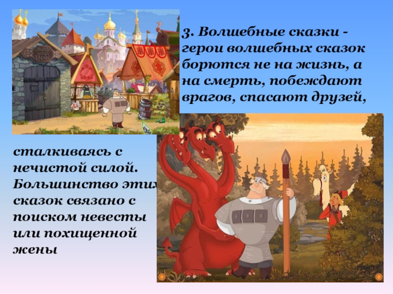 3. Волшебные сказки - герои волшебных сказок борются не на жизнь, а на смерть, побеждают врагов, спасают друзей,