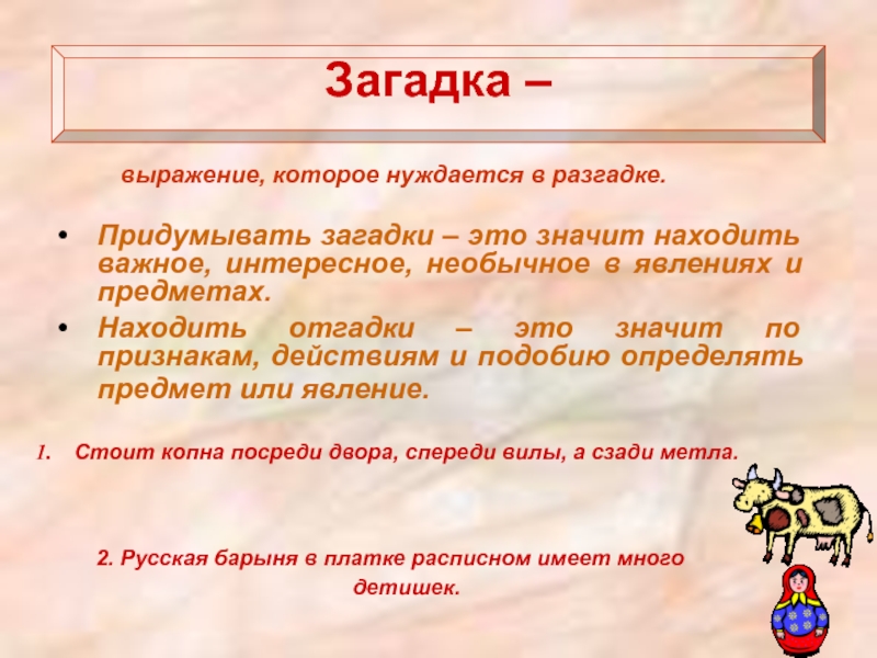 Находить отгадки – это значит по признакам, действиям и подобию определять предмет или явление.