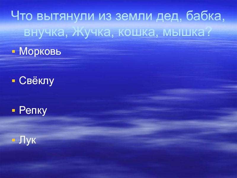 Что вытянули из земли дед, бабка, внучка, Жучка, кошка, мышка? МорковьСвёклуРепкуЛук