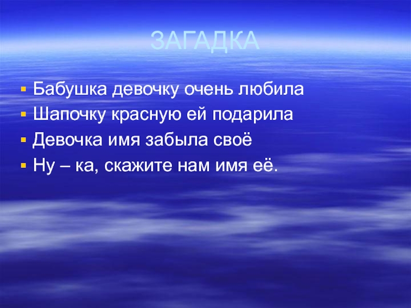 ЗАГАДКАБабушка девочку очень любилаШапочку красную ей подарилаДевочка имя забыла своёНу – ка, скажите нам имя её.