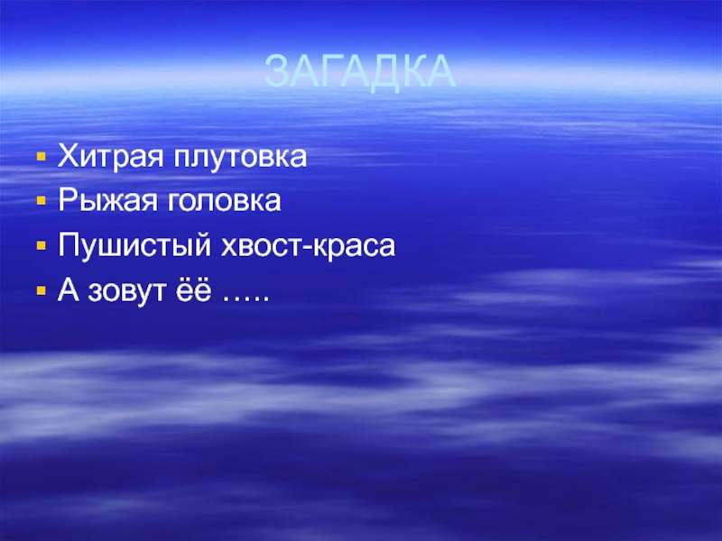 ЗАГАДКАХитрая плутовкаРыжая головкаПушистый хвост-красаА зовут ёё …..