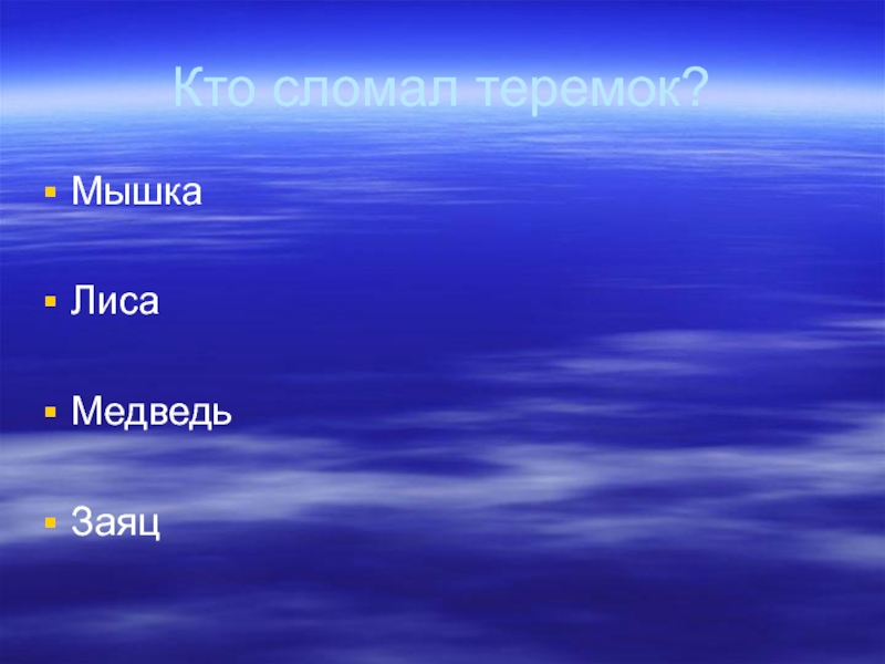 Кто сломал теремок?МышкаЛисаМедведьЗаяц