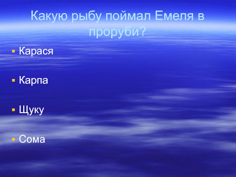 Слайд 24Какую рыбу поймал Емеля в проруби?