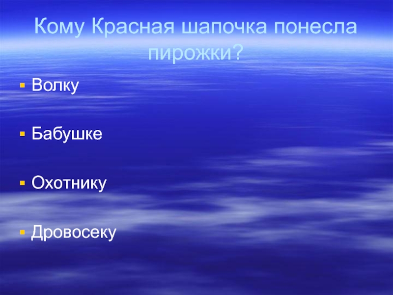 Кому Красная шапочка понесла пирожки?ВолкуБабушкеОхотникуДровосеку
