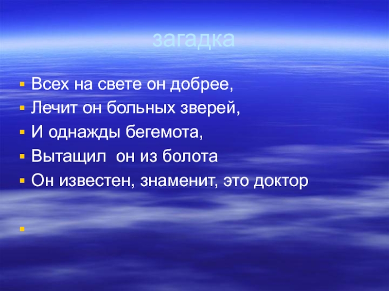 загадкаВсех на свете он добрее,Лечит он больных зверей,И однажды бегемота,Вытащил  он из болотаОн известен, знаменит, это доктор