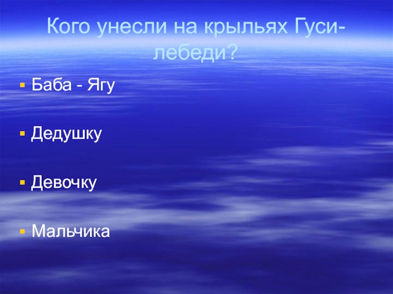 Кого унесли на крыльях Гуси-лебеди?Баба - ЯгуДедушкуДевочкуМальчика