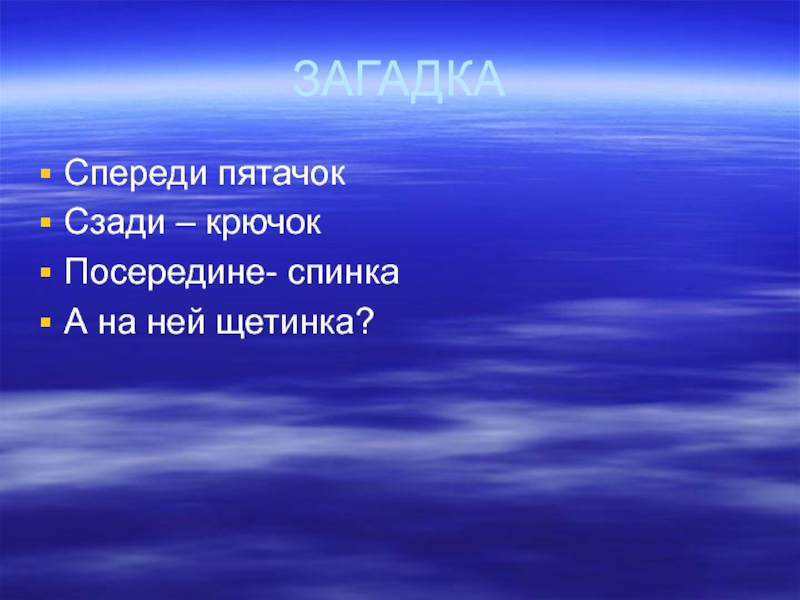 ЗАГАДКАСпереди пятачокСзади – крючокПосередине- спинкаА на ней щетинка?