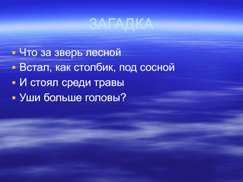 ЗАГАДКАЧто за зверь леснойВстал, как столбик, под соснойИ стоял среди травыУши больше головы?
