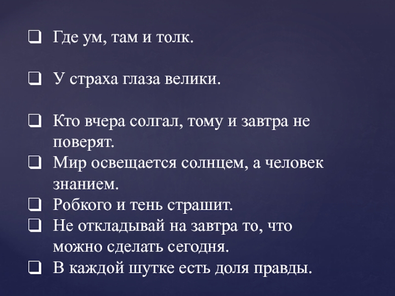 Где ум, там и толк.У страха глаза велики.Кто вчера солгал, тому и завтра не поверят.Мир освещается солнцем, а человек знанием.Робкого и тень страшит.Не откладывай на завтра то, что можно сделать сегодня.В каждой шутке есть доля правды.