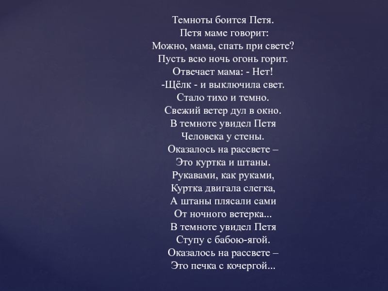 Темноты боится Петя. Петя маме говорит: Можно, мама, спать при свете? Пусть всю ночь огонь горит. Отвечает