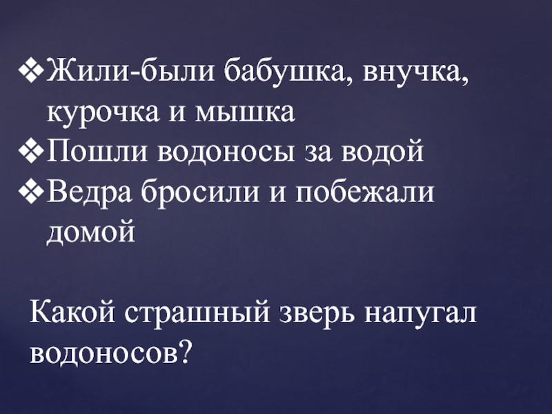 Жили-были бабушка, внучка, курочка и мышкаПошли водоносы за водойВедра бросили и побежали домойКакой страшный зверь напугал водоносов?