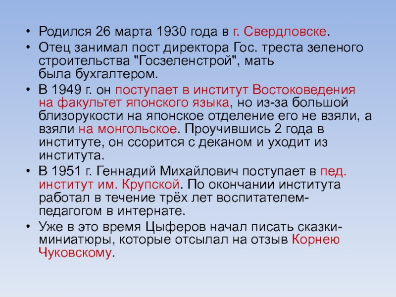 Слайд 1Геннадий Михайлович Цыферов  (1930-1972)  детский писатель-сказочник, сценарист, драматург