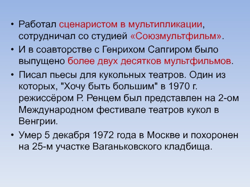Слайд 4Работал сценаристом в мультипликации, сотрудничал со студией «Союзмультфильм».