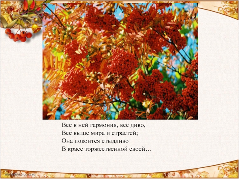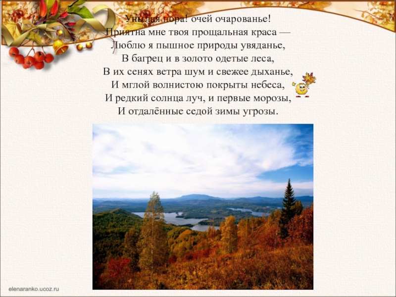 Слайд 4Унылая пора! очей очарованье! Приятна мне твоя прощальная краса — Люблю я пышное