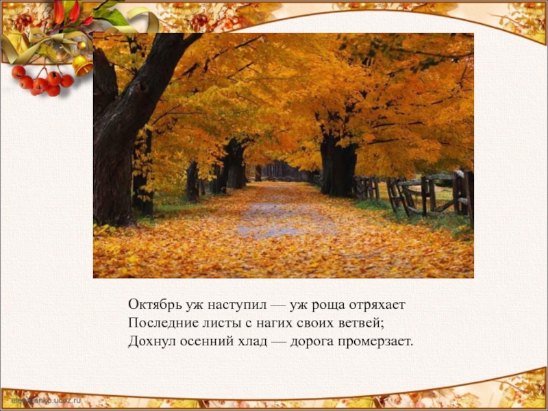 Слайд 2Октябрь уж наступил — уж роща отряхает Последние листы с нагих своих