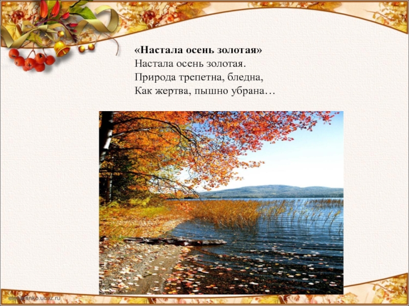 «Настала осень золотая»Настала осень золотая. Природа трепетна, бледна, Как жертва, пышно убрана…
