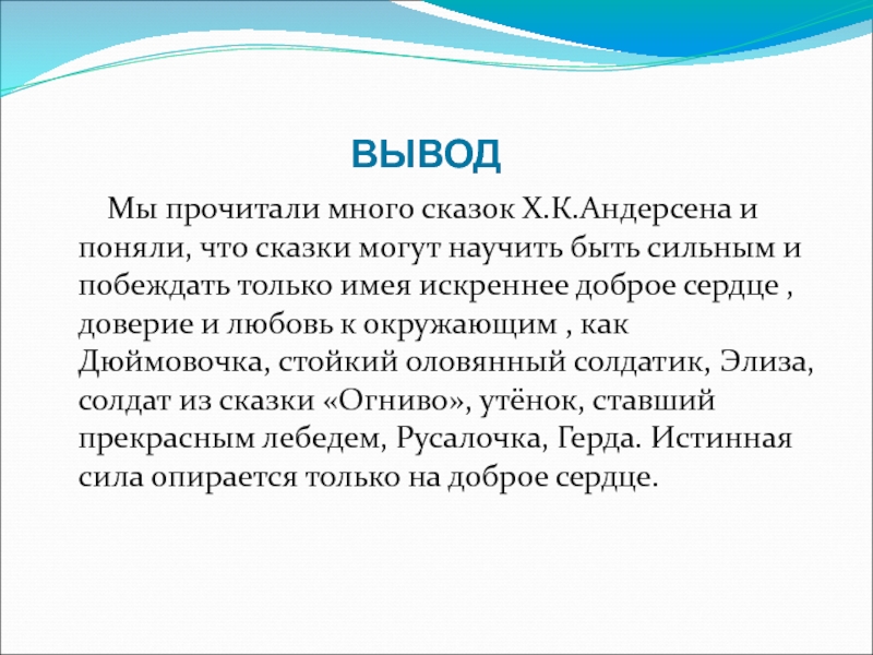 Мы прочитали много сказок Х.К.Андерсена и поняли, что сказки могут научить быть сильным и побеждать только имея искреннее доброе сердце , доверие и любовь к окружающим , как Дюймовочка, стойкий оловянный солдатик, Элиза, солдат из сказки «Огниво», утёнок, ставший прекрасным лебедем, Русалочка, Герда. Истинная сила опирается только на доброе сердце.