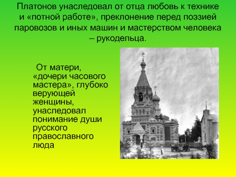 От матери, «дочери часового мастера», глубоко верующей женщины, унаследовал понимание души русского православного люда
