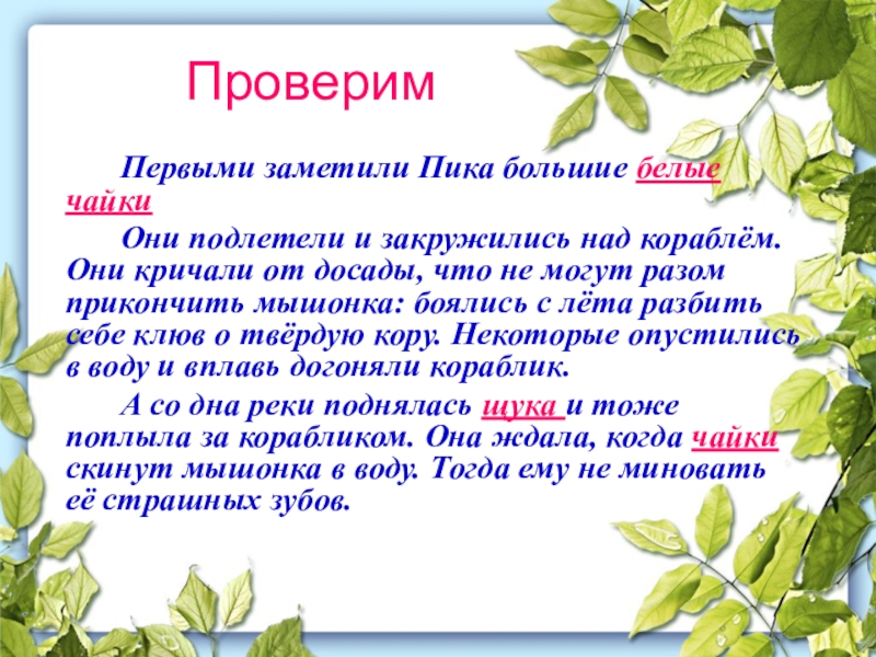 А со дна реки поднялась щука и тоже поплыла за корабликом. Она ждала, когда чайки скинут мышонка в воду. Тогда ему не миновать её страшных зубов.