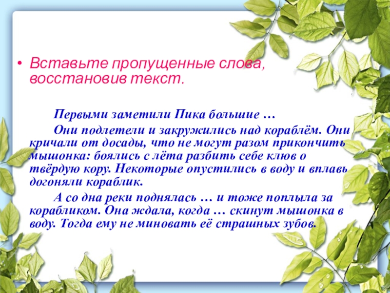 Слайд 11Вставьте пропущенные слова, восстановив текст.