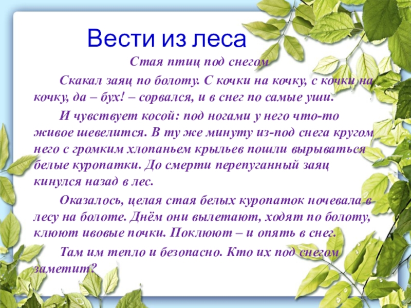 И чувствует косой: под ногами у него что-то живое шевелится. В ту же минуту из-под снега кругом него с громким хлопаньем крыльев пошли вырываться белые куропатки. До смерти перепуганный заяц кинулся назад в лес.