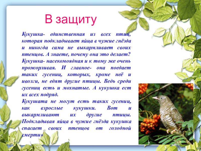 Кукушата не могут есть таких гусениц, как взрослые кукушки. Вот и выкармливают их другие птицы. Подкладывая яйца в чужие гнёзда кукушка спасает своих птенцов от голодной смерти»