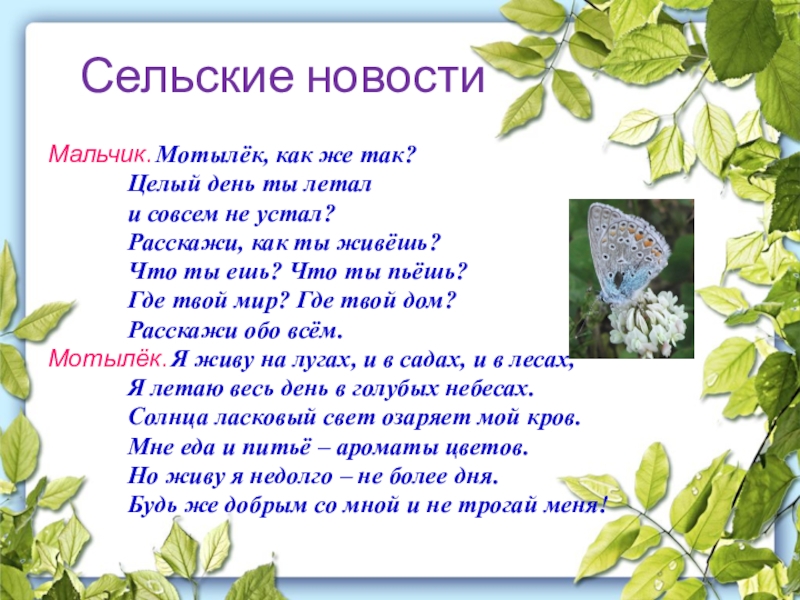 Мотылёк. Я живу на лугах, и в садах, и в лесах,