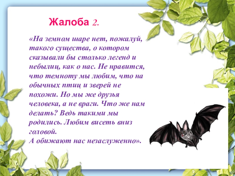 бы столько легенд и небылиц, как о нас. Не нравится, что темноту мы любим, что на обычных птиц и зверей не похожи. Но мы же друзья человека, а не враги. Что же нам делать? Ведь такими мы родились. Любим висеть вниз головой.