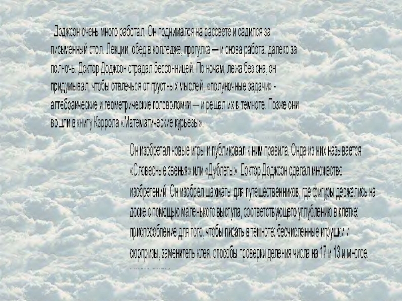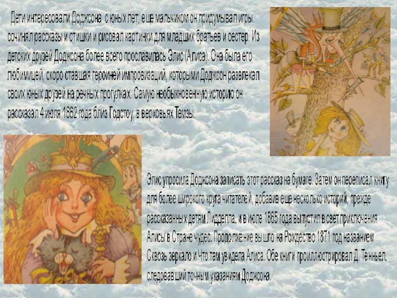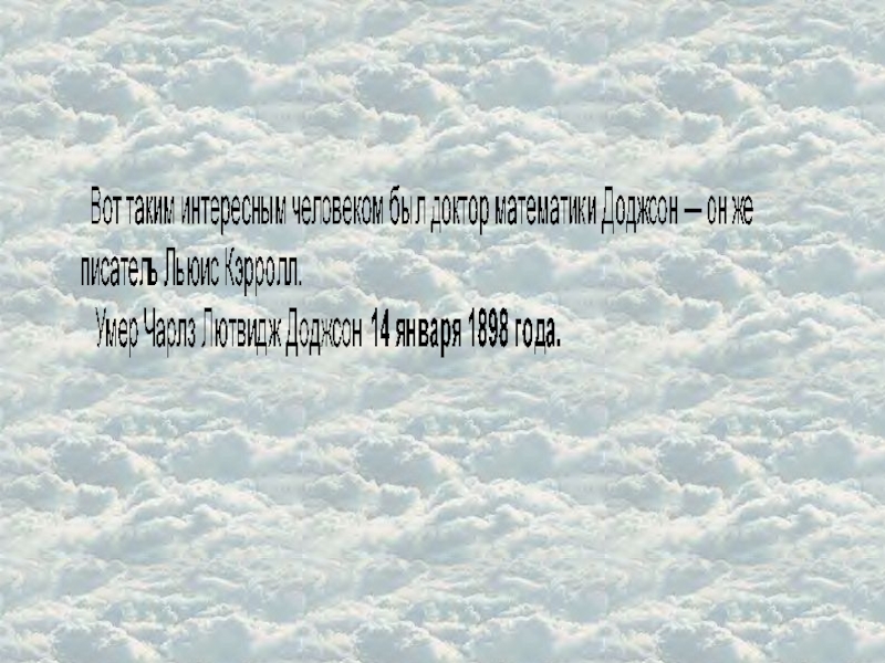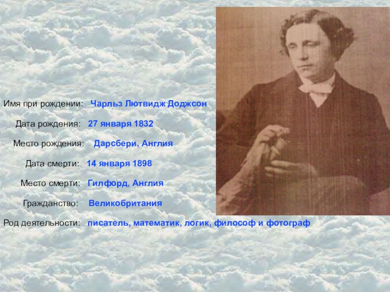 Имя при рождении: Чарльз Лютвидж Доджсон Дата рождения: 27 января 1832 Место рождения: Дарсбери, Англия Дата смерти: 14 января 1898 Место смерти: