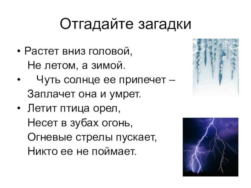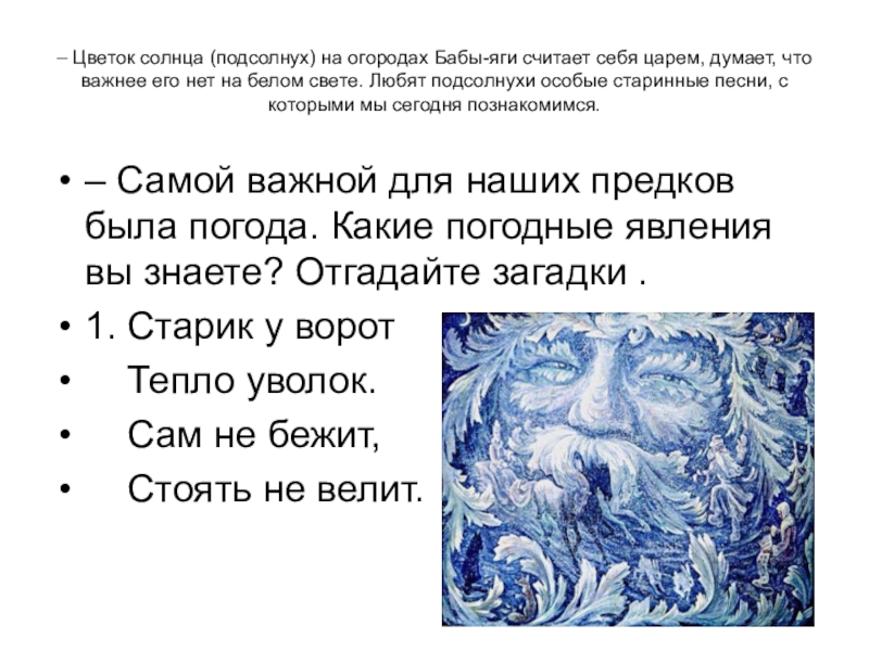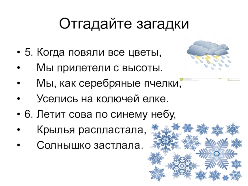 – Самой важной для наших предков была погода. Какие погодные явления вы знаете? Отгадайте загадки .