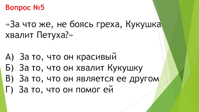«За что же, не боясь греха, Кукушка хвалит Петуха?»