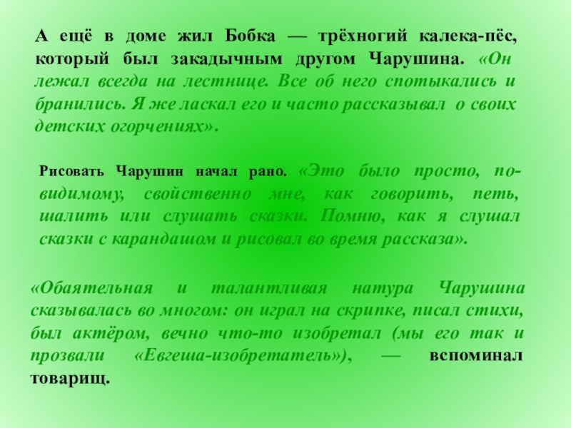 Рисовать Чарушин начал рано. «Это было просто, по-видимому, свойственно мне, как говорить, петь, шалить или слушать сказки. Помню, как я слушал сказки с карандашом и рисовал во время рассказа».