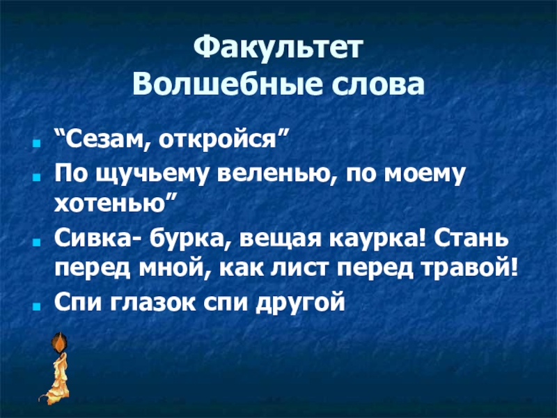 Факультет  Волшебные слова “Сезам, откройся” По щучьему веленью, по моему хотенью” Сивка- бурка, вещая каурка! Стань