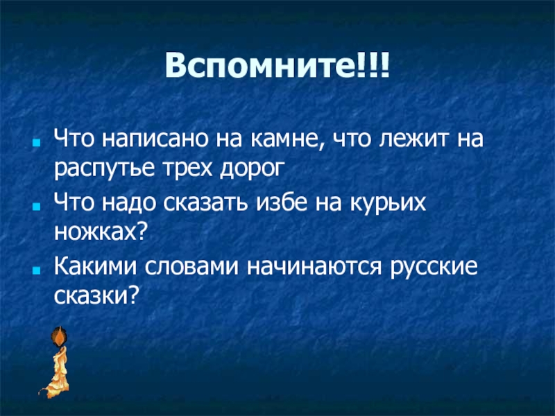 Вспомните!!!Что написано на камне, что лежит на распутье трех дорог Что надо сказать избе на курьих ножках?