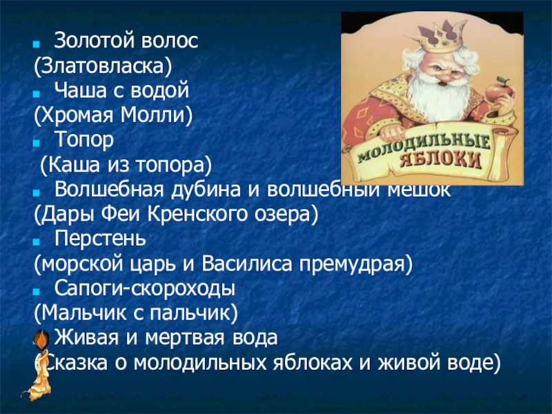 Золотой волос (Златовласка)Чаша с водой (Хромая Молли)Топор (Каша из топора)Волшебная дубина и волшебный мешок (Дары Феи Кренского