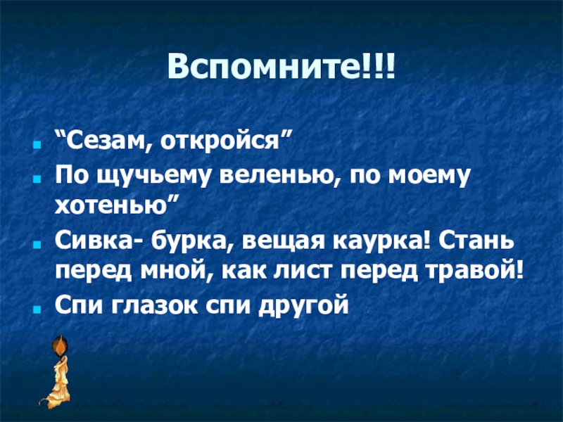 Вспомните!!!“Сезам, откройся” По щучьему веленью, по моему хотенью” Сивка- бурка, вещая каурка! Стань перед мной, как лист
