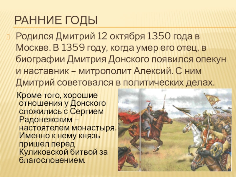 Кроме того, хорошие отношения у Донского сложились с Сергием Радонежским – настоятелем монастыря. Именно к нему князь пришел перед Куликовской битвой за благословением.