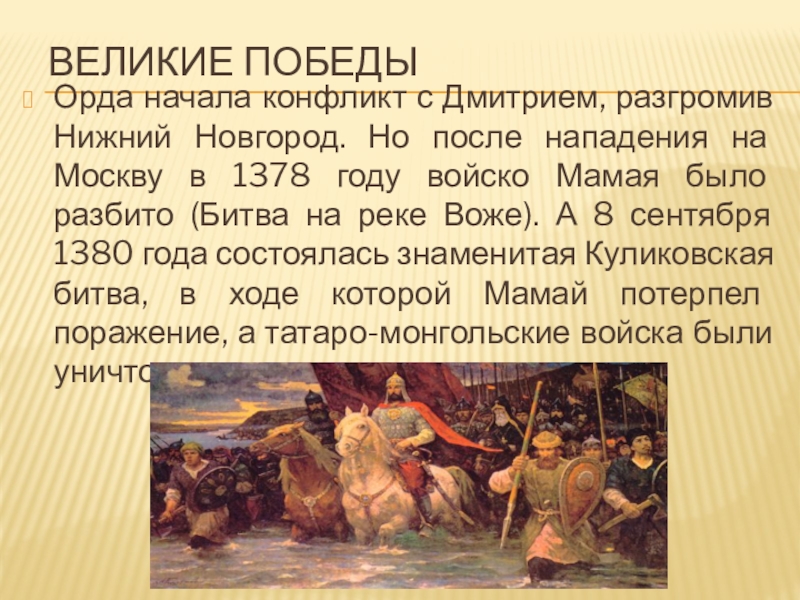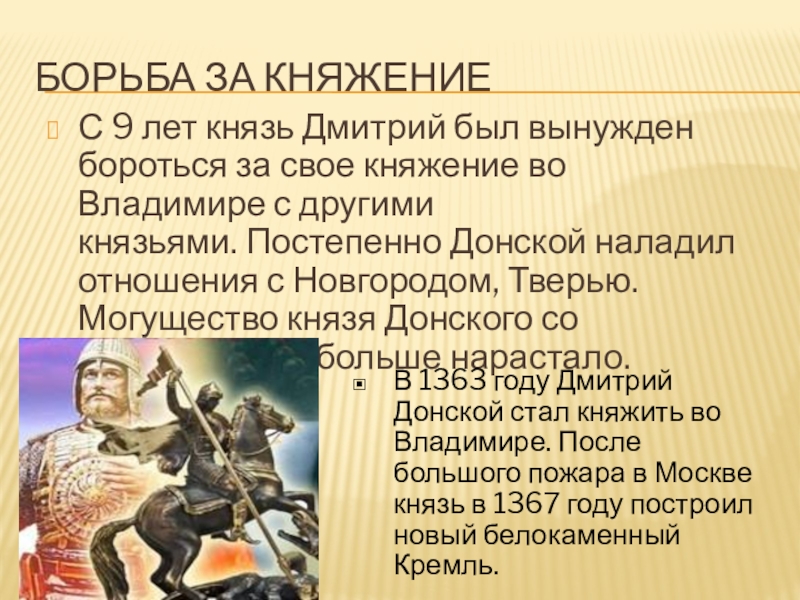 В 1363 году Дмитрий Донской стал княжить во Владимире. После большого пожара в Москве князь в 1367 году построил новый белокаменный Кремль.