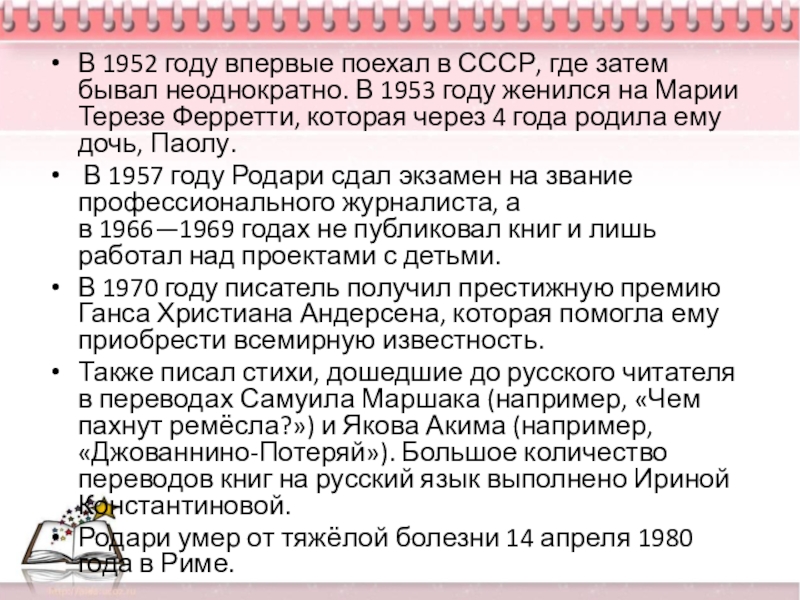 В 1948 году Родари стал журналистом в коммунистической газете «Унита» и начал писать книжки для детей.
