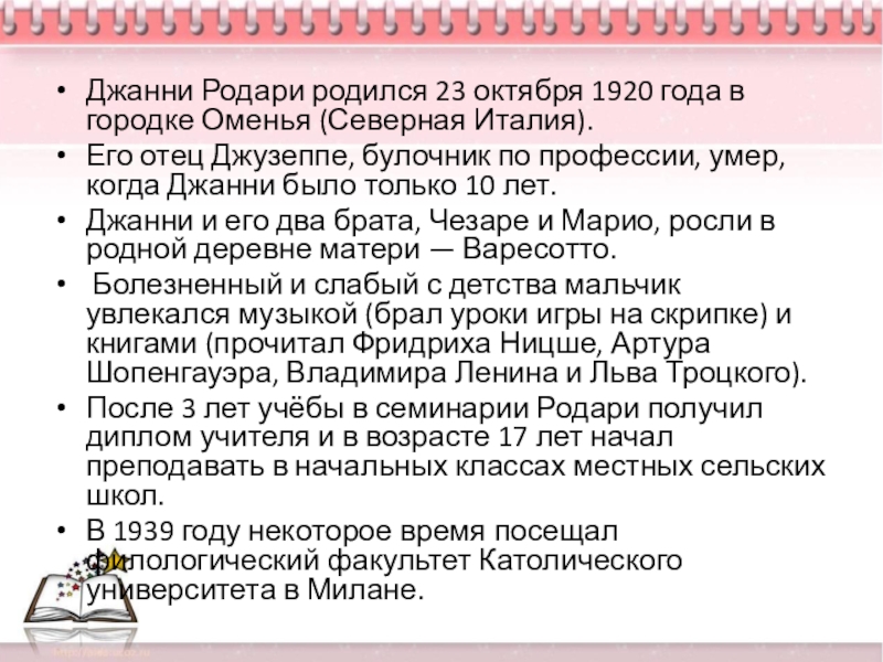 Слайд 3Джанни Родари родился 23 октября 1920 года в городке Оменья (Северная Италия).