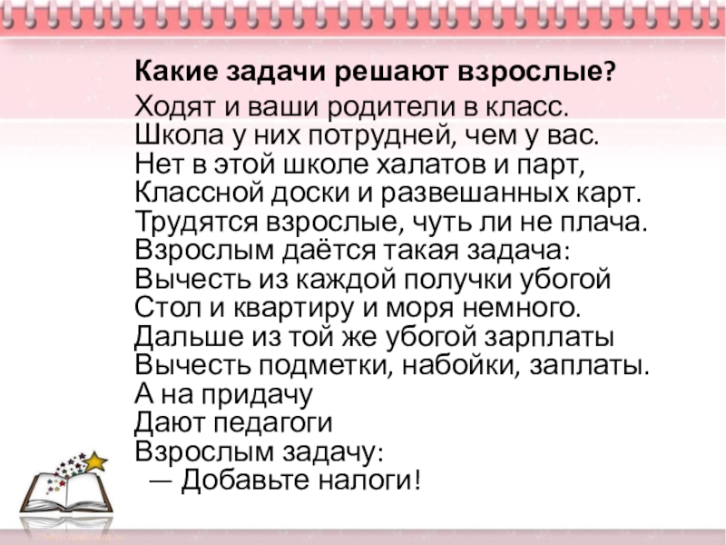 потрудней, чем у вас. Нет в этой школе халатов и парт, Классной доски и развешанных карт. Трудятся взрослые, чуть ли не плача. Взрослым даётся такая задача: Вычесть из каждой получки убогой Стол и квартиру и моря немного. Дальше из той же убогой зарплаты Вычесть подметки, набойки, заплаты. А на придачу Дают педагоги Взрослым задачу:   — Добавьте налоги!