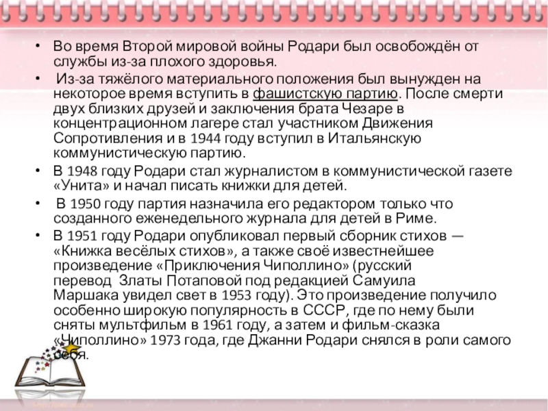 Слайд 5Во время Второй мировой войны Родари был освобождён от службы из-за плохого здоровья.