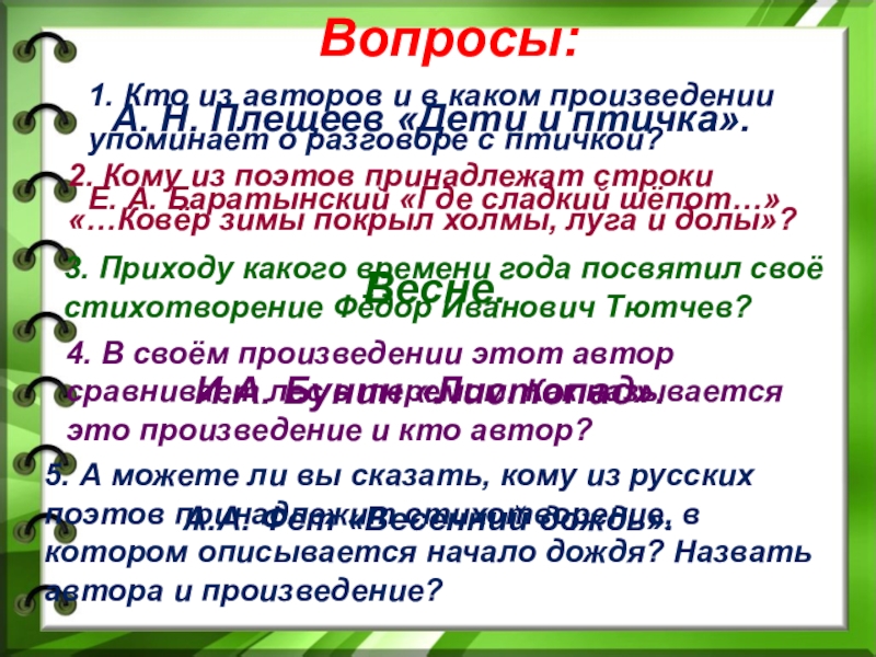 3. Приходу какого времени года посвятил своё стихотворение Фёдор Иванович Тютчев?