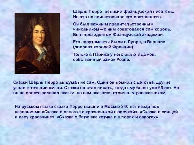 Сказки Шарль Перро выдумал не сам. Одни он помнил с детства, другие узнал в течении жизни. Сказки он стал писать, когда ему было уже 65 лет. Но он не просто записал сказки, но сам оказался отличным рассказчиком.