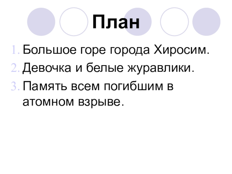 ПланБольшое горе города Хиросим.Девочка и белые журавлики.Память всем погибшим в атомном взрыве.